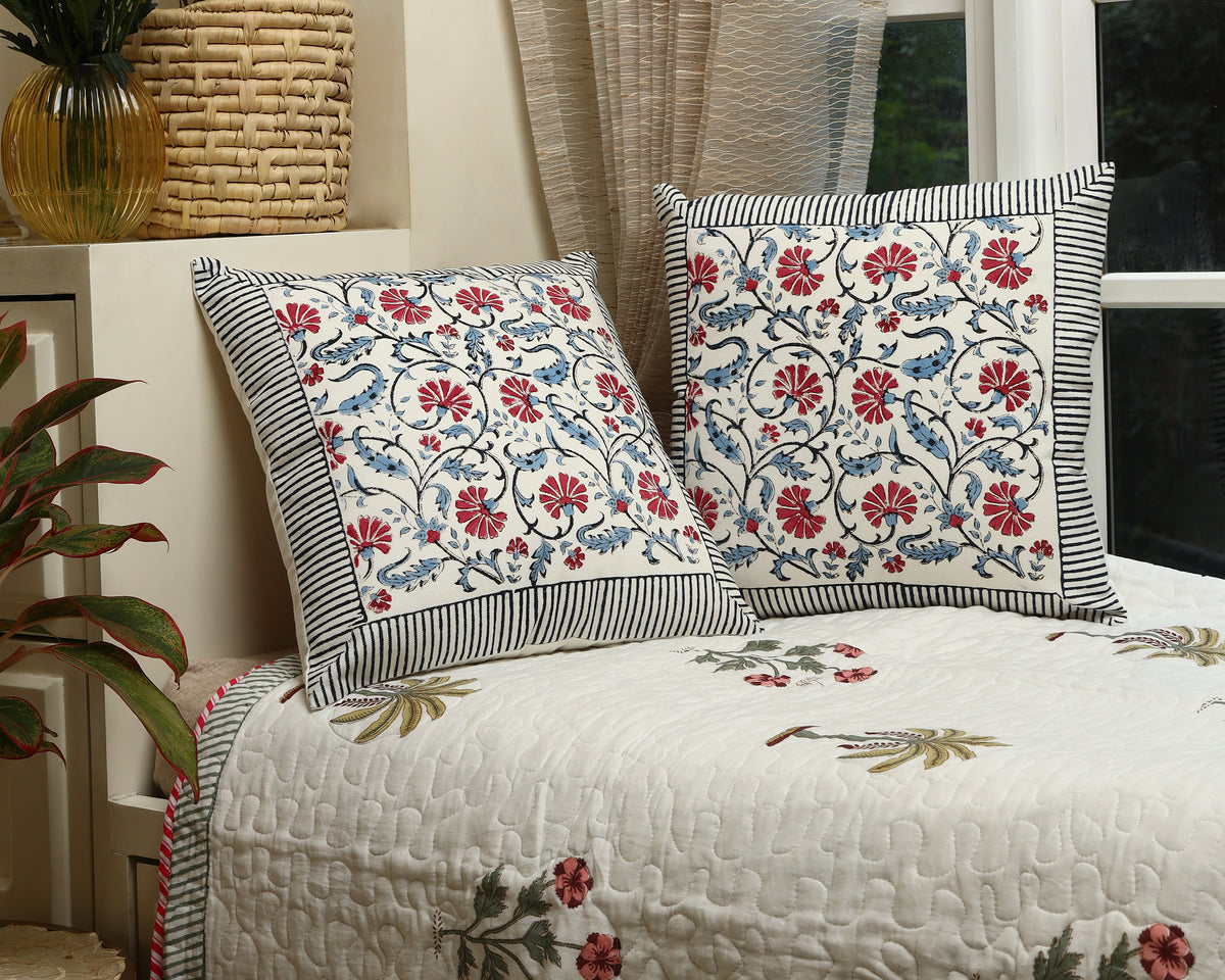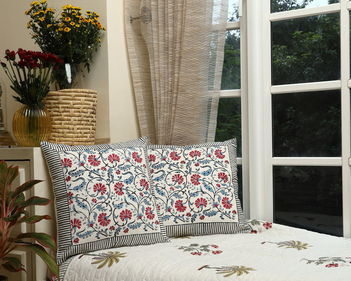 Showcasing intricate floral motifs in rich hues of red and blue, framed with an elegant striped border ,these cushion covers bring together tradition and sophistication.